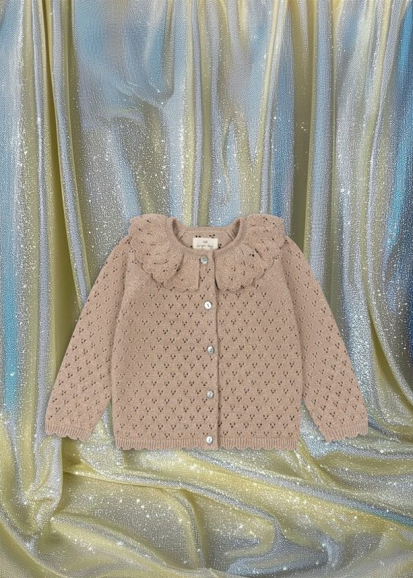 Knitted cardigan with a rounded collar and hole knit pattern.