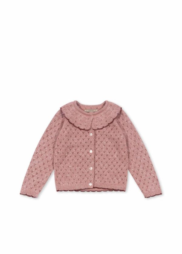 Knitted cardigan with a rounded collar and hole knit pattern.